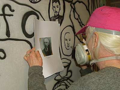 Then I fired up my airbrush, loaded up some black paint, put on my respirator and turned on the air and the fan. And I started with the face of Kathy, Jack's daughter. (Thanks very much to dear Jimmy, my husband, who took the pix for me, that have me in them.)